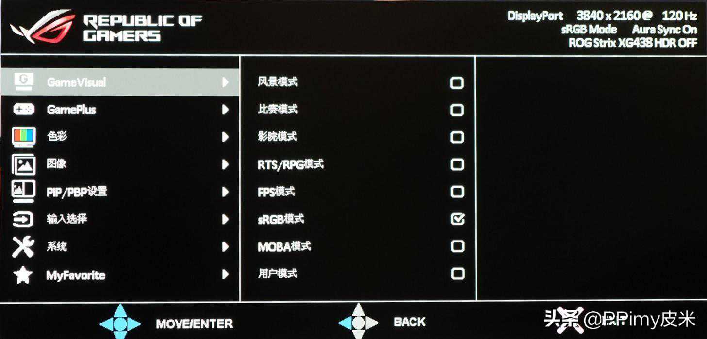 说道到显示模式,华硕ROGXG438Q显示器具备:风景模式、比赛模式、影院模式、RTS/RPG模式、FPS模式、sRGB模式、MOBA模式、用户模式,共8种适合日常和游戏的模式。