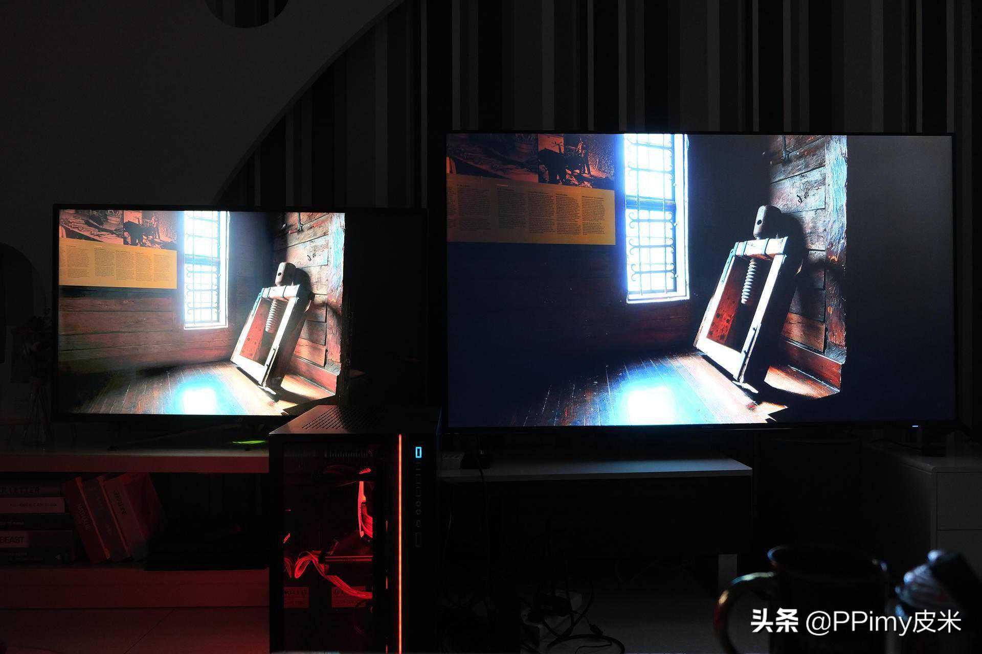 这张一闪而过的画面,如果使用的是右边的电视,你一定只会注意到窗户和窗户旁的设备。如果是使用华硕ROGXG438Q,你一定还会留意左边的木墙和上面的挂画。