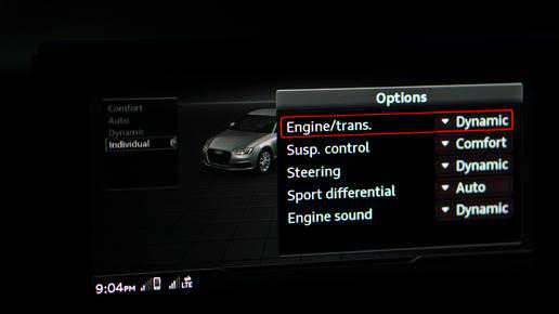AudiDriveSelect,可以选择的几种模式里有comfort,auto,dynamic,还有individual(就是自定义)。我现在的设定如图,因为选了运动包所以有了可调节悬挂跟差速器调节选项。