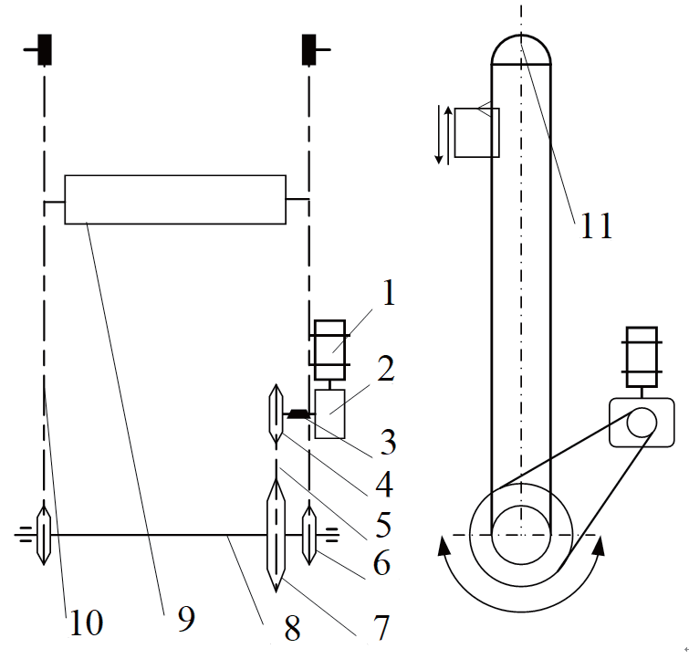 1.电动机2.减速器3.制动器4.小链轮5.减速链条6.循环链轮7.大链轮8.传动轴9.芯模托架10.循环链条11.半圆支撑导轨