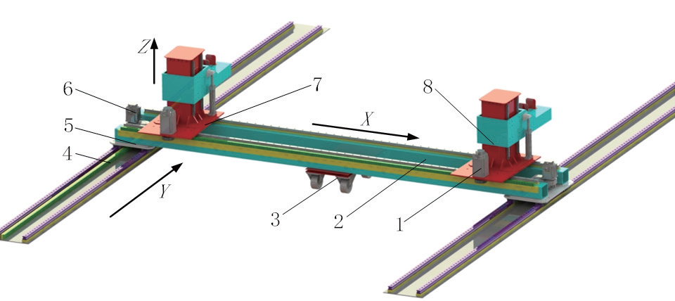 1.X轴驱动电机2.X轴支撑梁3.滚动支撑小车4.Y轴滑动轨道5.XY连接台6.Y轴驱动电机7.XZ连接台8.升降抬举装置