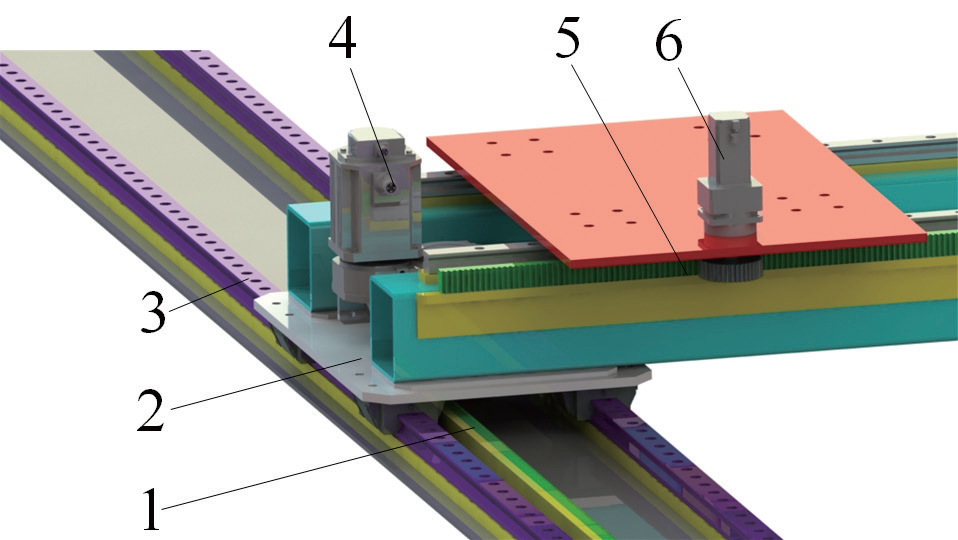 X、Y轴是机械手的重要组成部件之一,通过X、Y轴的移动来实现Z轴托举装置在芯模存储库中的正确定位,如图5所示,其主要由Y轴齿轮条、XY连接台、Y轴导轨、Y轴伺服电机、X轴齿轮齿条、Y轴伺服电机组成。
