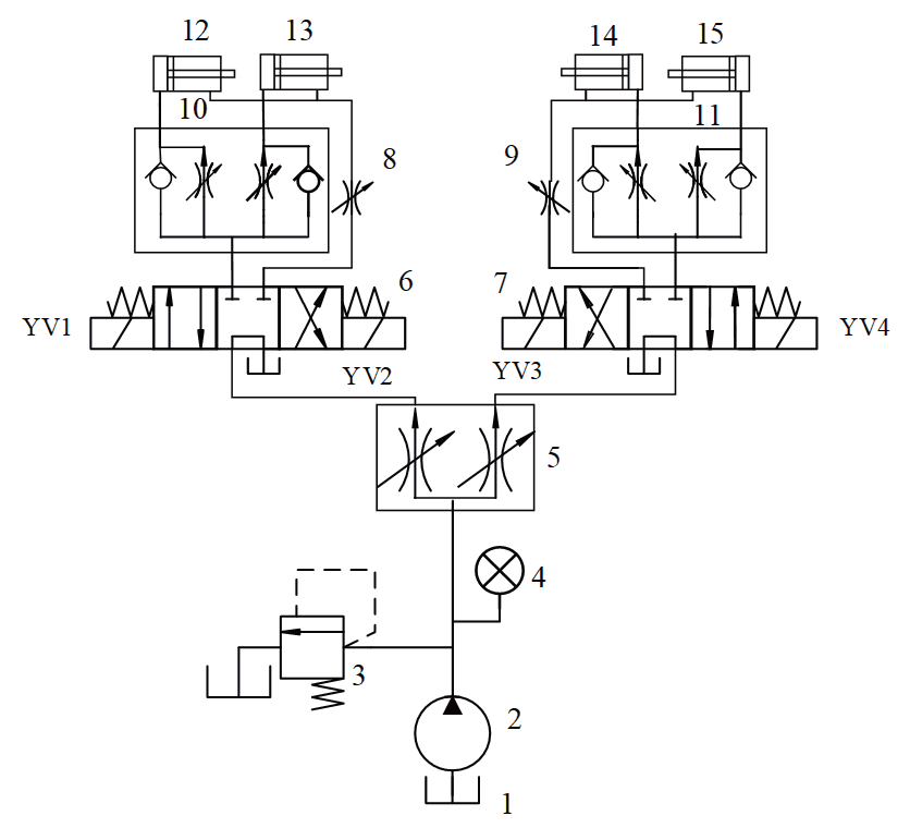 液压泵开始工作,溢流阀调节所需压力,并恒定将油箱中的油通过分流阀等量分流到2个三位四通电磁换向阀。需要控制上升时,电磁铁YV1、YV4得电,换向阀6左位接通,换向阀7右位接通,液压油经节流阀流入液压缸,推动4个液压缸活塞杆同步上升,当活塞杆上升至触碰行程开关,电磁铁失电,2个三位四通电磁换向阀回中位,此时系统保持一定压力。控制下降时,电磁铁YV2、YV3得电,换向阀6右位接通,换向阀7左位接通,液压油推动4个活塞杆同步下降。整个过程通过调节节流阀控制升降速度,压力表实时监测油路压力值。