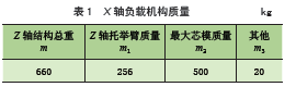 搬运机械手主体采用直角坐标式形式,由Y轴滑移轨道、X轴支撑梁、Z轴升降托举装置等部件组成,其中X轴支撑梁作为主要的承力部件,除承受升降托举装置负载外,还包括芯模负载和Z轴升降产生的惯性力,所以对其进行仿真分析十分必要。表1为X轴负载机构质量表。
