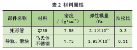 Z轴升降惯性力由升降加速度求得。设计要求中Z轴运动速度为0.1m/s,加速时间0.1s,可得运动时的加速度a=1m/s2,因此Z轴最大惯性力利用AnsysWorkbench进行有限元分析前,为保证较高的分析效率,首先需对该结构几何形状进行简化,如去除凸台、倒圆角、螺钉孔以及筋板等特征[14-15]。利用Ansys的数据接口技术使SolidWorks建模软件和Workbench软件连接,建立X轴支撑架简化模型后直接导入有限元软件中。材料属性值如表2所示。