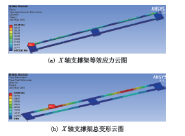 然后进行网格划分,添加载荷和约束等后得到X轴支撑架应力以及变形云图,如图8所示。