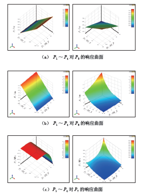 根据设计参数范围生成多组设计数据,再对数据求解,描绘出设计参数和目标参数之间的变化曲线和曲面,分析得到各参数的变化对目标参数的影响趋势。设计参数有7个:P1-DS_C、P2-DS_A、P3-DS_B、P4-DS_H、P5-M、P6-D、P7-F,D为支撑架最大变形量,F为支撑架所受最大应力值,其中P1、P2、P3、P4为4个输入,分别为支撑板宽度、支撑梁横截面的高度、支撑梁横截面的宽度、支撑梁横截面的厚度,P5、P6、P7为3个输出,分别为支撑架总质量、最大变形量、最大应力值,其中P5、P7作为约束条件,P6为优化目标,如图10所示。