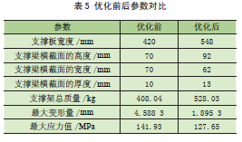 对3组数据进行对比分析,发现第3组的最大变形量最小,最大应力值也最小,总质量比前两组稍大,但在允许范围内,相对而言,第3组方案要优于另外2组方案,所以最终选择第3组方案,对该方案参数取整。优化前后参数对比见表5。