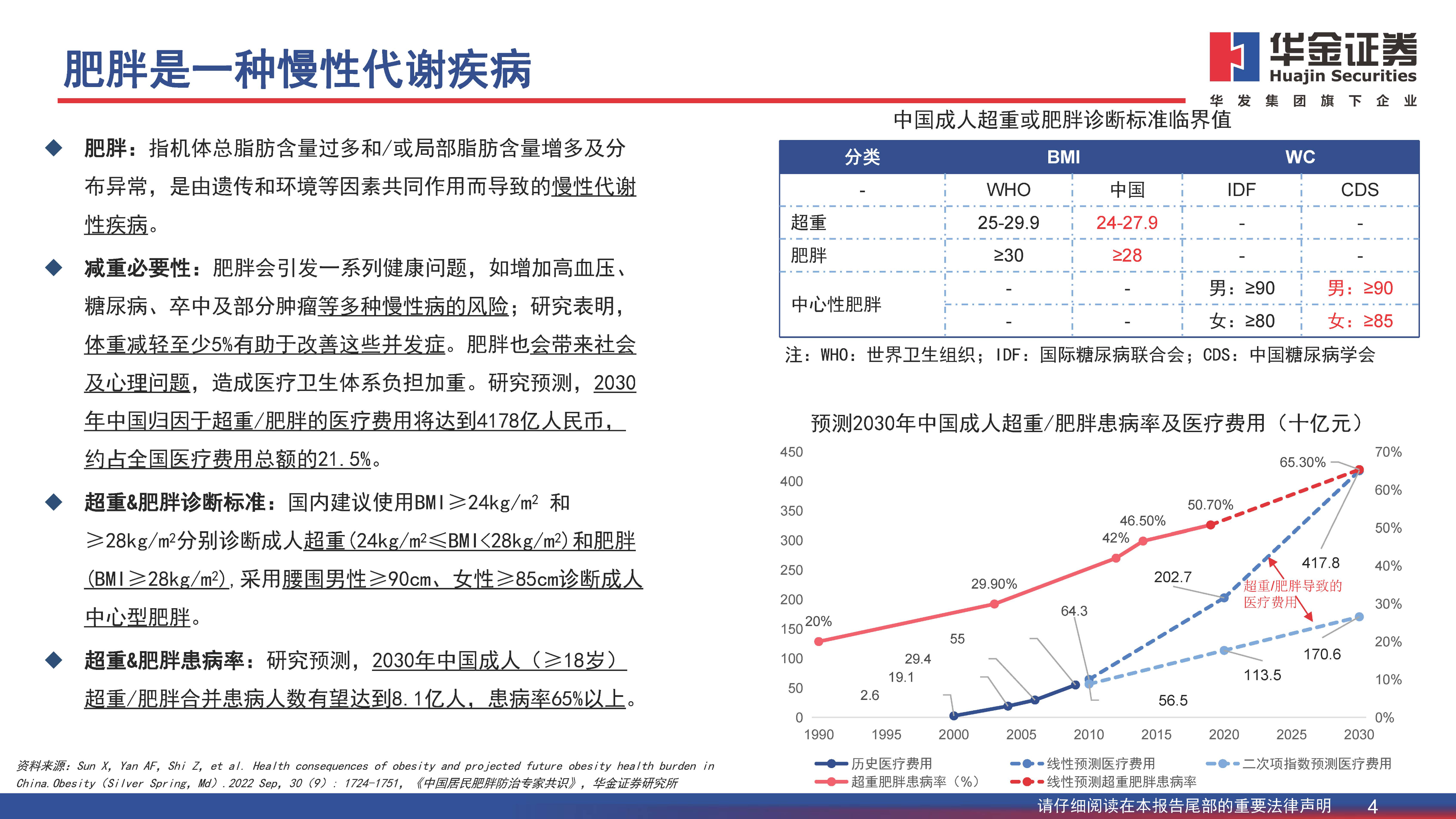肥胖:指机体总脂肪含量过多和/或局部脂肪含量增多及分布异常,是由遗传和环境等因素共同作用而导致的慢性代谢性疾病。减重必要性:肥胖会引发一系列健康问题,如增加高血压、糖尿病、卒中及部分肿瘤等多种慢性病的风险;研究表明,体重减轻至少5%有助于改善这些并发症。肥胖也会带来社会及心理问题,造成医疗卫生体系负担加重。研究预测,2030年中国归因于超重/肥胖的医疗费用将达到4178亿人民币,约占全国医疗费用总额的21.5%。超重肥胖诊断标准:国内建议使用BMI≥24kg/m2和≥28kg/m2分别诊断成人超重(24kg/m2≤BMI28kg/m2)和肥胖(BMI≥28kg/m2),采用腰围男性≥90cm、女性≥85cm诊断成人中心型肥胖。超重肥胖患病率:研究预测,2030年中国成人(≥18岁)超重/肥胖合并患病人数有望达到8.1亿人,患病率65%以上。