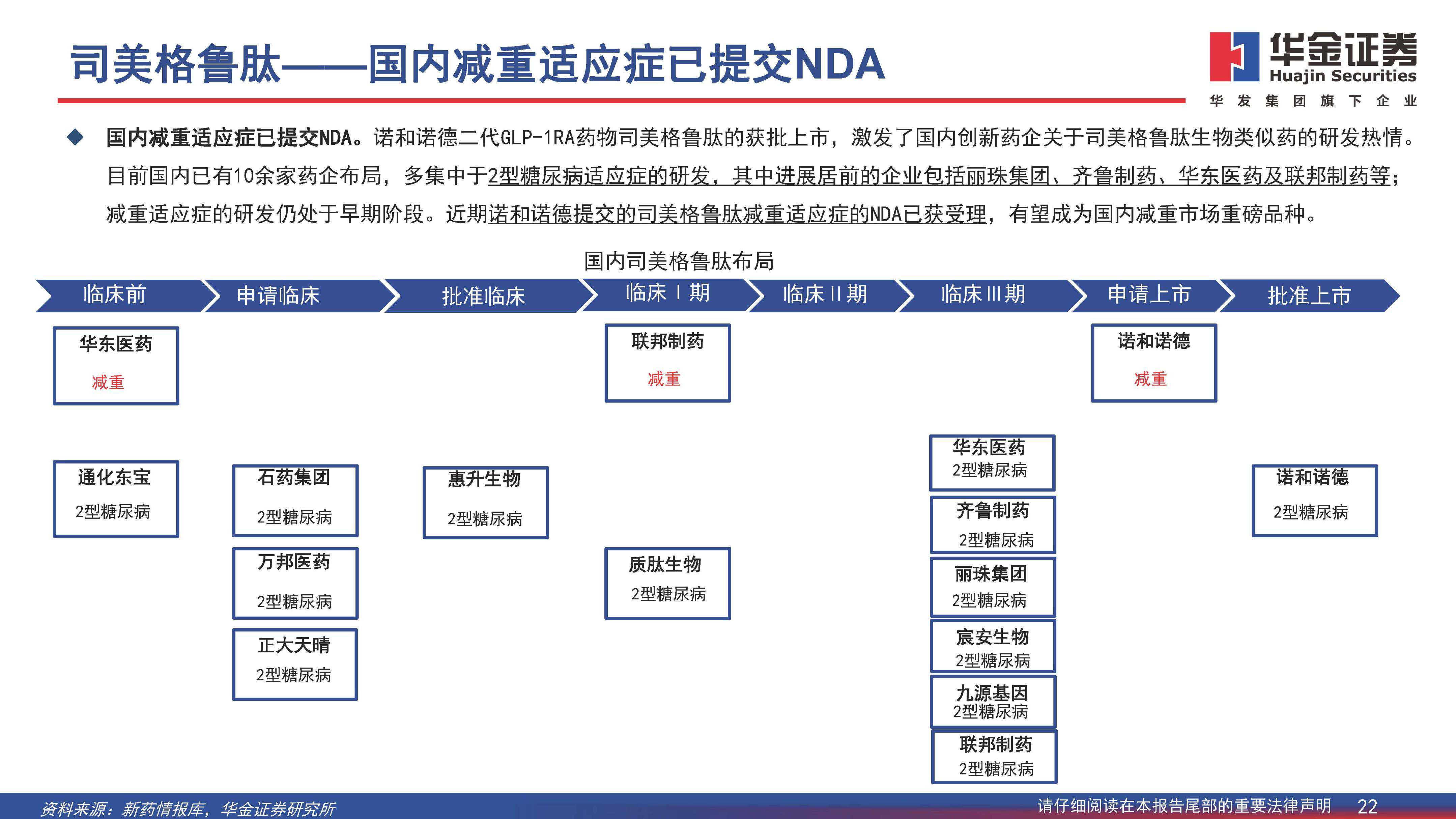 国内减重适应症已提交NDA。诺和诺德二代GLP-1RA药物司美格鲁肽的获批上市,激发了国内创新药企关于司美格鲁肽生物类似药的研发热情。目前国内已有10余家药企布局,多集中于2型糖尿病适应症的研发,其中进展居前的企业包括丽珠集团、齐鲁制药、华东医药及联邦制药等;减重适应症的研发仍处于早期阶段。近期诺和诺德提交的司美格鲁肽减重适应症的NDA已获受理,有望成为国内减重市场重磅品种。