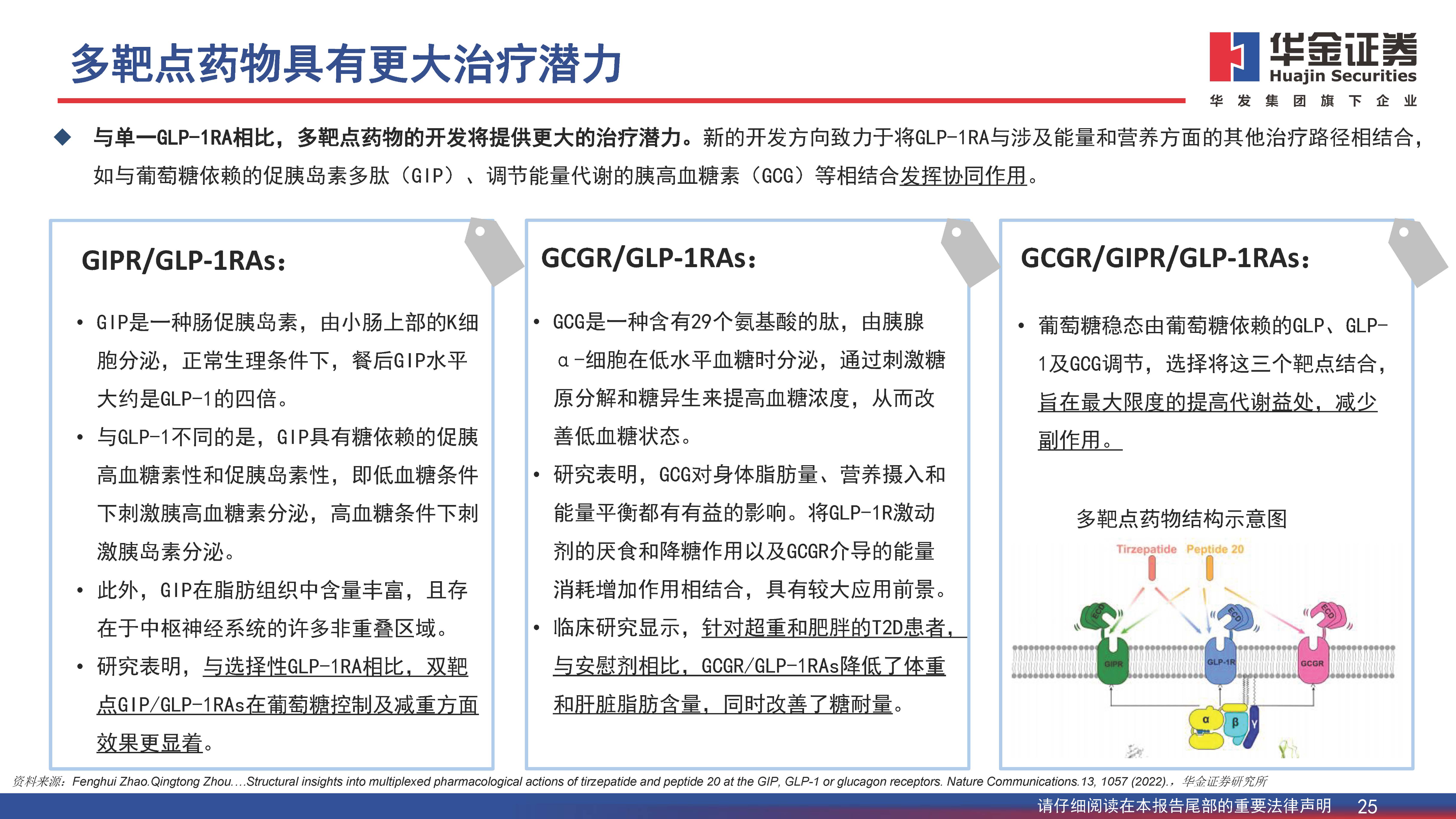 与单一GLP-1RA相比,多靶点药物的开发将提供更大的治疗潜力。新的开发方向致力于将GLP-1RA与涉及能量和营养方面的其他治疗路径相结合,如与葡萄糖依赖的促胰岛素多肽(GIP)、调节能量代谢的胰高血糖素(GCG)等相结合发挥协同作用。