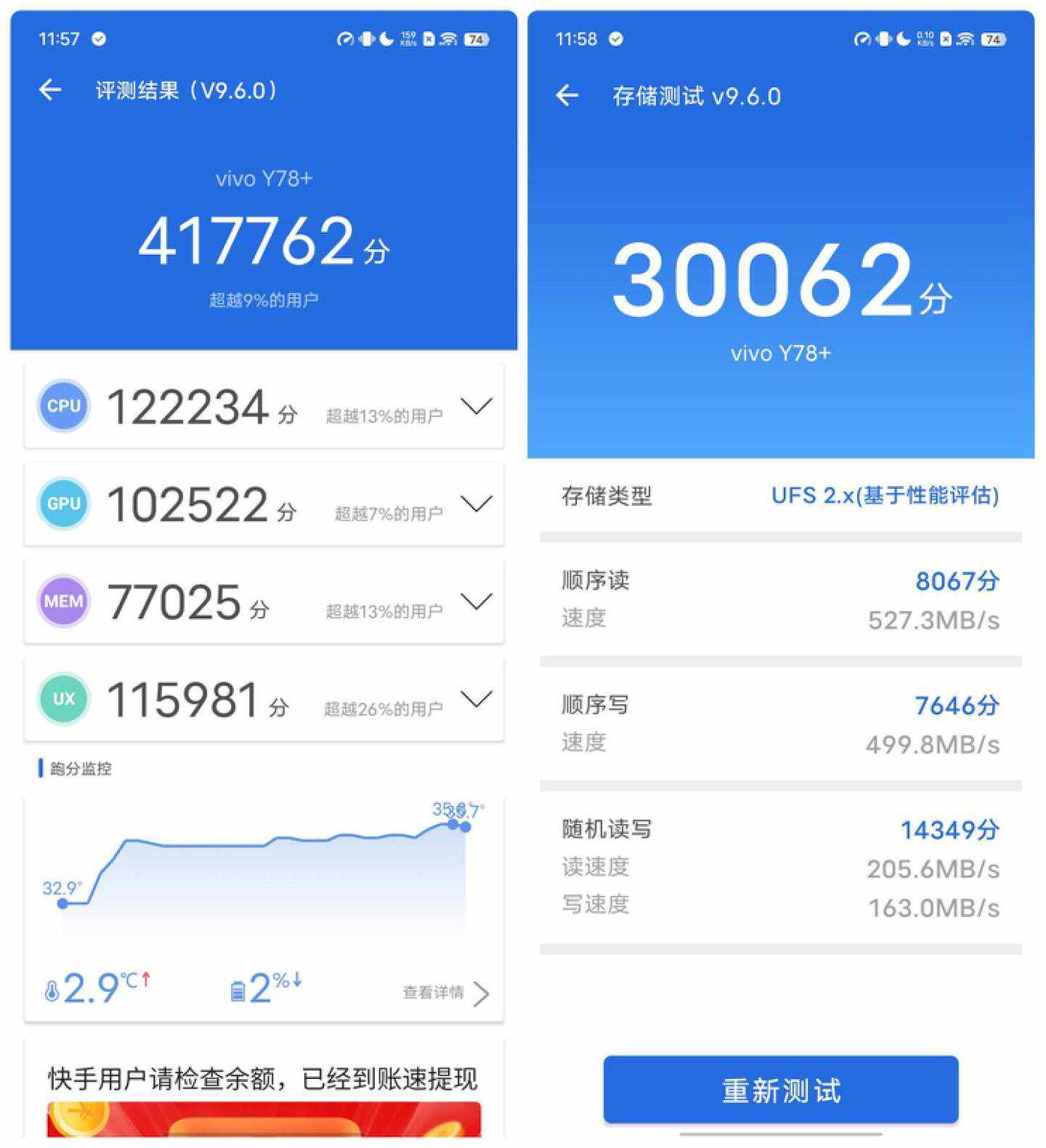接下来,IT之家针对vivoY78+的性能进行了实测,首先是安兔兔跑分测试,测得这款手机安兔兔跑分为417762分。