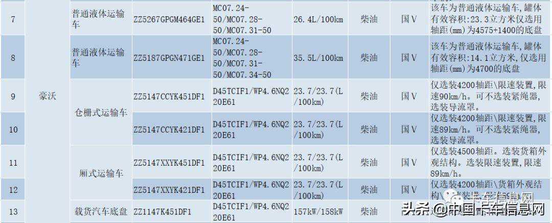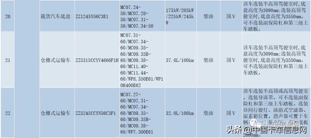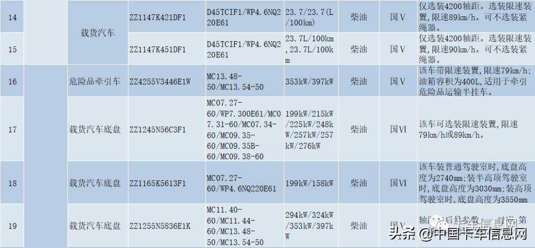 其中,特种作业车底盘(ZZ5237N521GF1)、载货汽车底盘(ZZ1147K451DF1)分别搭载MC07/、D45TCIF1/发动机,满足国六排放标准。特种作业车底盘总质量超限,仅用于改装汽车起重机、消防车、混凝土泵车、清障车、油田作业类车辆。