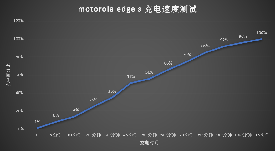 与之匹配的快充方案为20W(并非只是充电头20W),实测5分钟可以从1%电量充至8%、10分钟可以充至14%、20分钟可以充至25%、30分钟可以充至35%、50分钟可以充至56%、60分钟可以充至66%,将5000mAh电池充至100%大概需要1小时55分钟。
