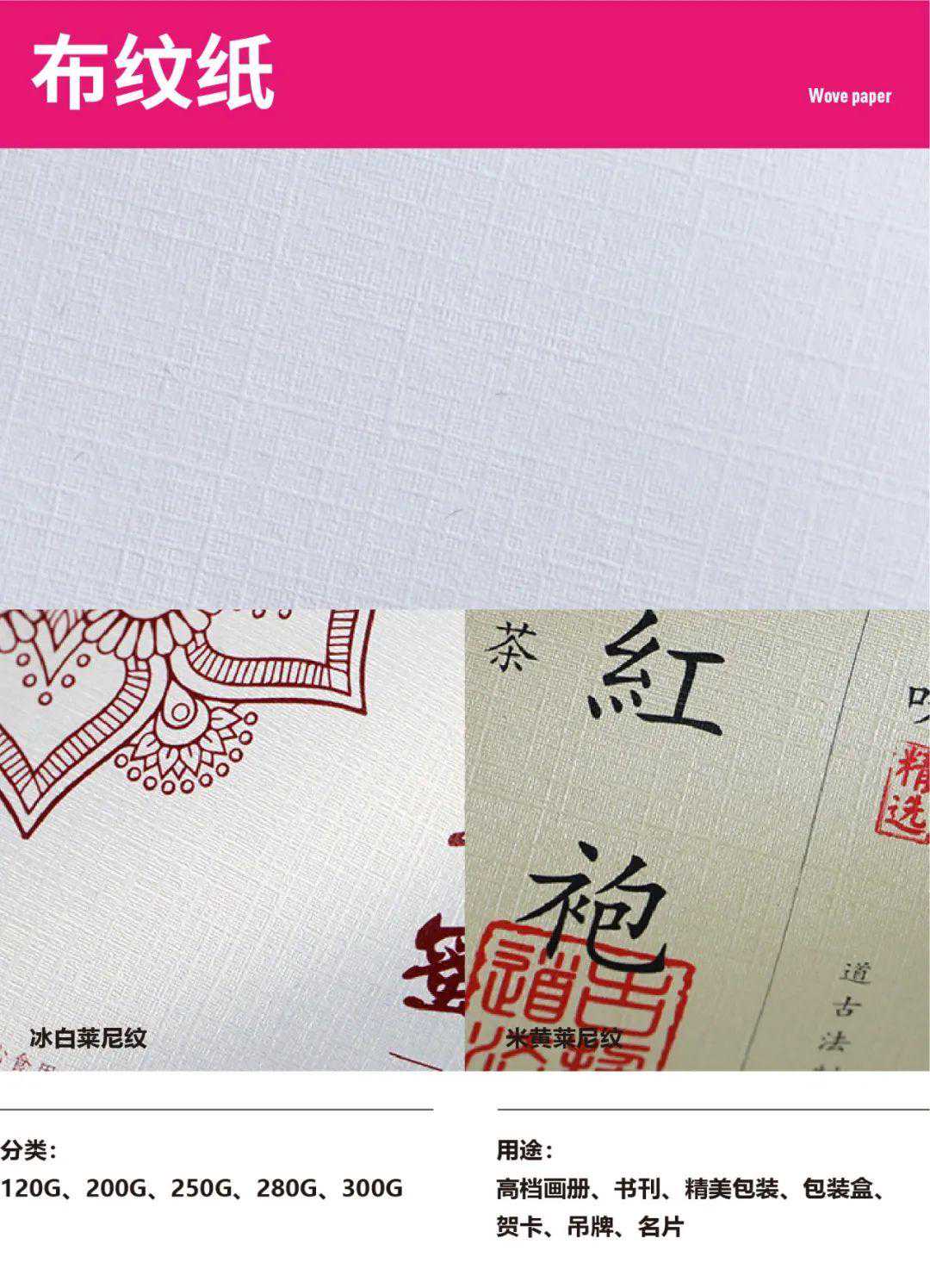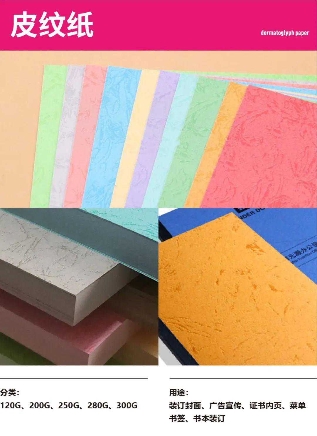 皮纹纸的纹理比较深,表面凹凸不平,皮纹纸用途比较广泛,厚克重的适合做样本封面、标书,薄克重的皮纹适合做礼品包装和装帧封面。
