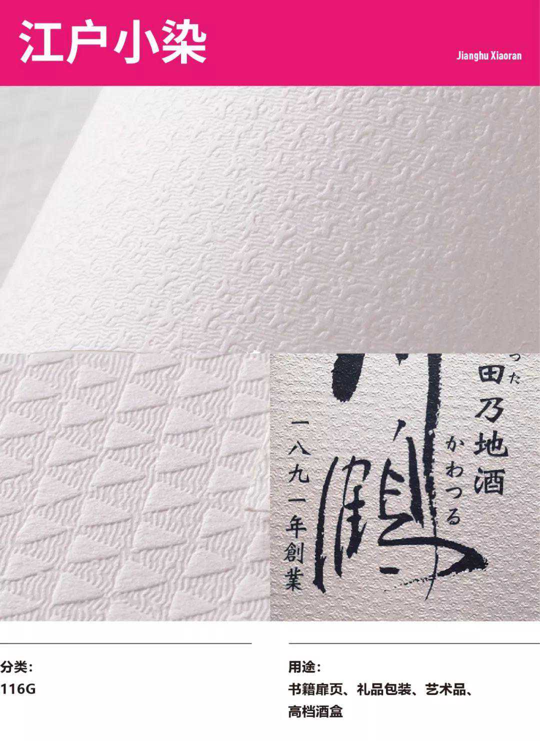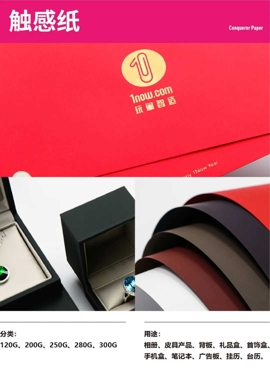触感纸是一种具有绒面触感的纸张,加工工艺较为复杂,但印刷效果好些。常用在高档包装行业。