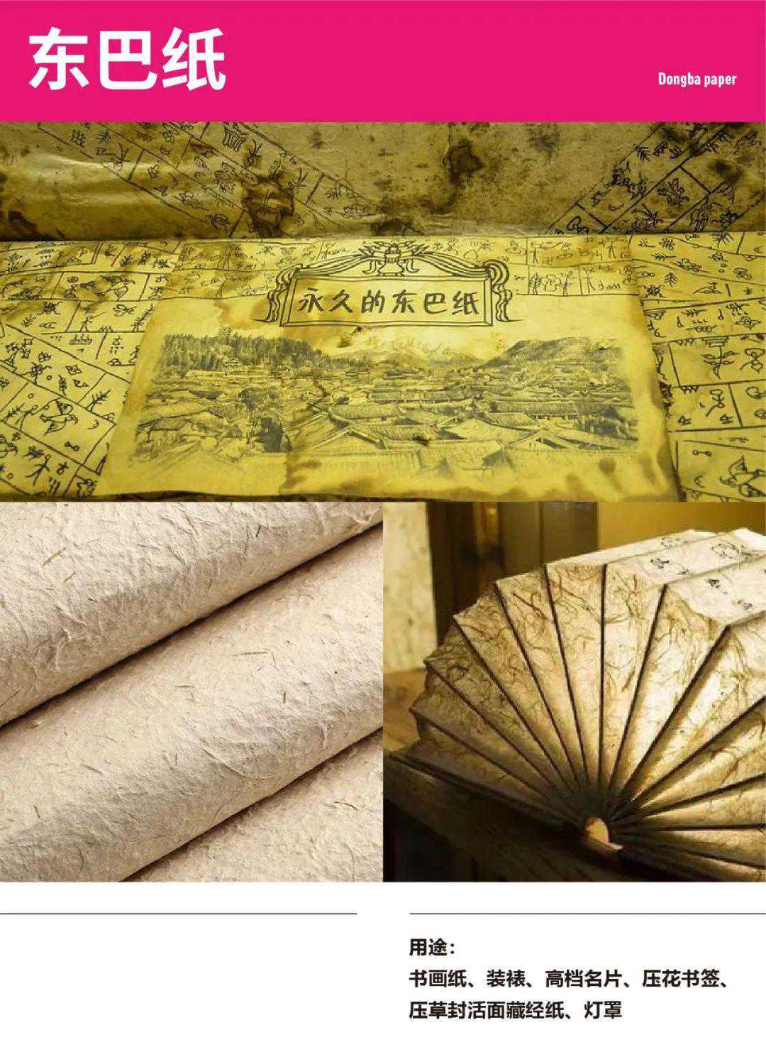 东巴纸是纳西族东巴祭司用来记录东巴经和绘制东巴画的一种专用纸,是一种十分珍稀的少数民族手工纸,可用于抄写东巴经书的纸张。这种纸张,厚实、耐磨、防虫蛀、较光滑、呈象牙色。经抄写后由于长时间在烧有火的房屋里翻用而被烟熏的缘故,会变成古铜色,有古色古香的样子。最原始的手工造纸,有人类手工造纸“活化石”之称。