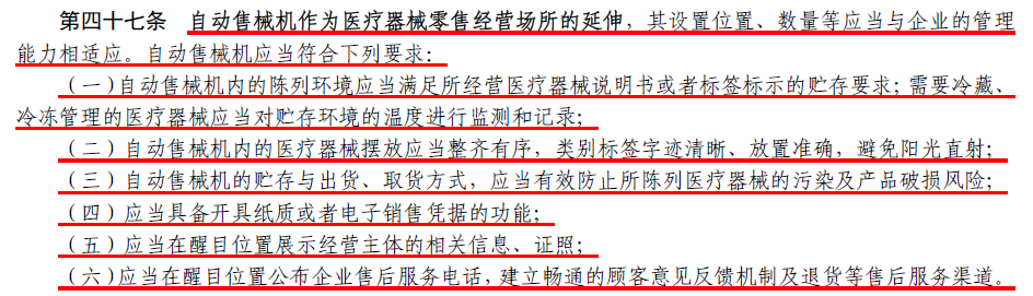 2023年12月7日,国家药监局发布最新版《医疗器械经营质量管理规范》(以下简称《规范》)中明确:“自动售械机作为医疗器械零售经营场所的延伸”可以售卖医疗器械。