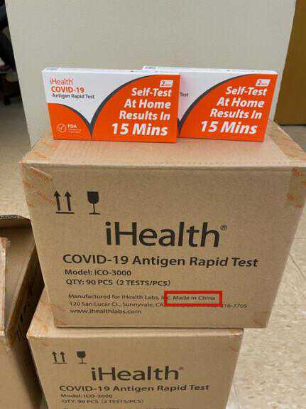 为应对奥密克戎变异毒株导致病例激增,白宫最近与美国邮政局发起一项新措施,向全美家庭邮寄5亿份新冠病毒抗原快速检测试剂盒。根据美国国防部网站消息,参与家用快速检测试剂盒的主要供应商中有家名为iHealthLabs的公司,虽然总部位于加利福尼亚州,但自测盒上却印有“中国制造”的英文字样。路透社称,iHealth是中国公司“九安医疗”的子公司。该公司在1月13日与美国政府签订价值12.75亿美元的合同。