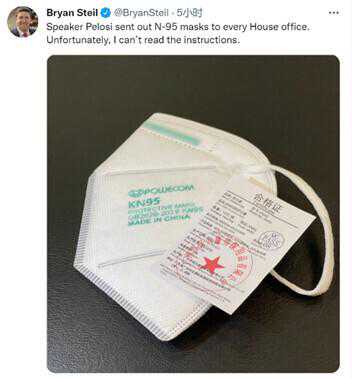 来自威斯康星州的美国共和党籍众议员布莱恩·斯蒂尔当地时间20日在其推特上发了张照片。照片主体是一个KN95口罩,口罩上印着“中国制造(MADEINCHINA)”