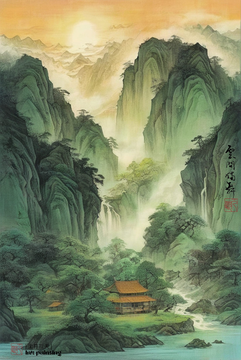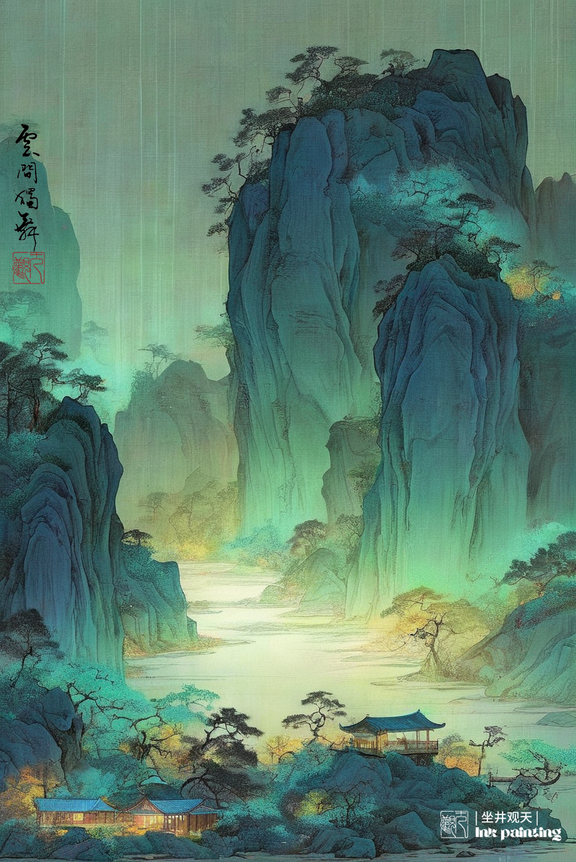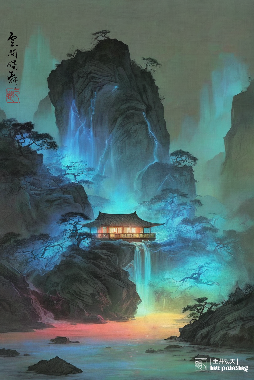 国韵山水《大山深处有人家》分享,采用水墨表现技法和西方绘画的绚丽色彩相结合,由stablediffusion软件软件生成。操作参数:Steps:44,Sampler:DPM++3MSDEKarras,CFGscale:8,Seed:3863348366,Size:824x1232,Modelhash:6e0ba74ac1,Model:sdvn7Nijistylexl_v1,Lorahashes:"Inkfreehandpainting-000004:3c61d76b511c,Chinesedecorativelandscapescenery-000002:9eea1a2e3446,Suzhoualleyarchitecture-000003:e02f8a7cc0d0",Version:提示词:水墨画杰作(戏剧性,强烈:1.4),山水风景夕阳,黄昏,夜色,巨石,悬崖,瀑布,湖水,建筑,老树,飞鸟,杰作,最好的质量,(巨石:1.2),(悬崖:1.2),32kuhd,疯狂的细节,复杂的细节,超级细节,超级质量,高细节,超级细节,杰作,yssk的新概念,景观背景,lora:Chinesedecorativelandscapescenery-000002:0.6,lora:Inkfreehandpainting-000004:0.5