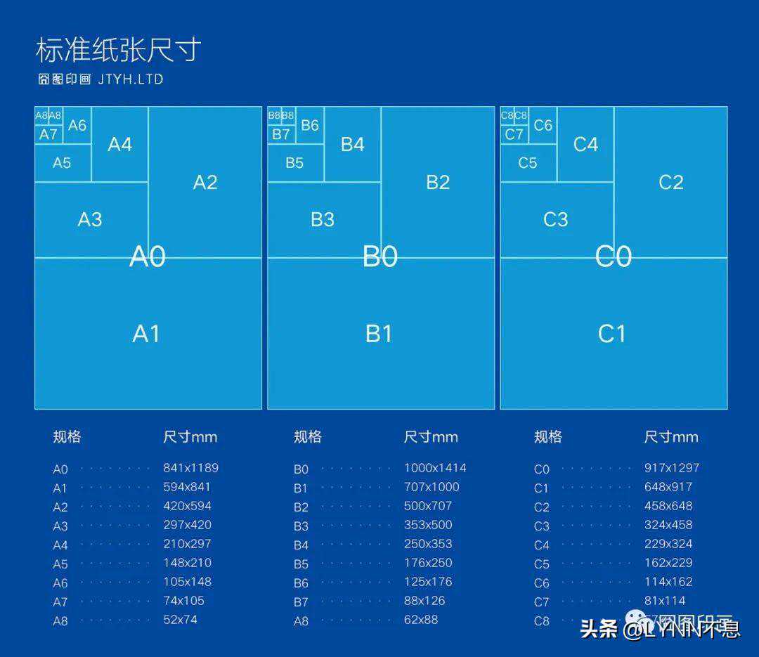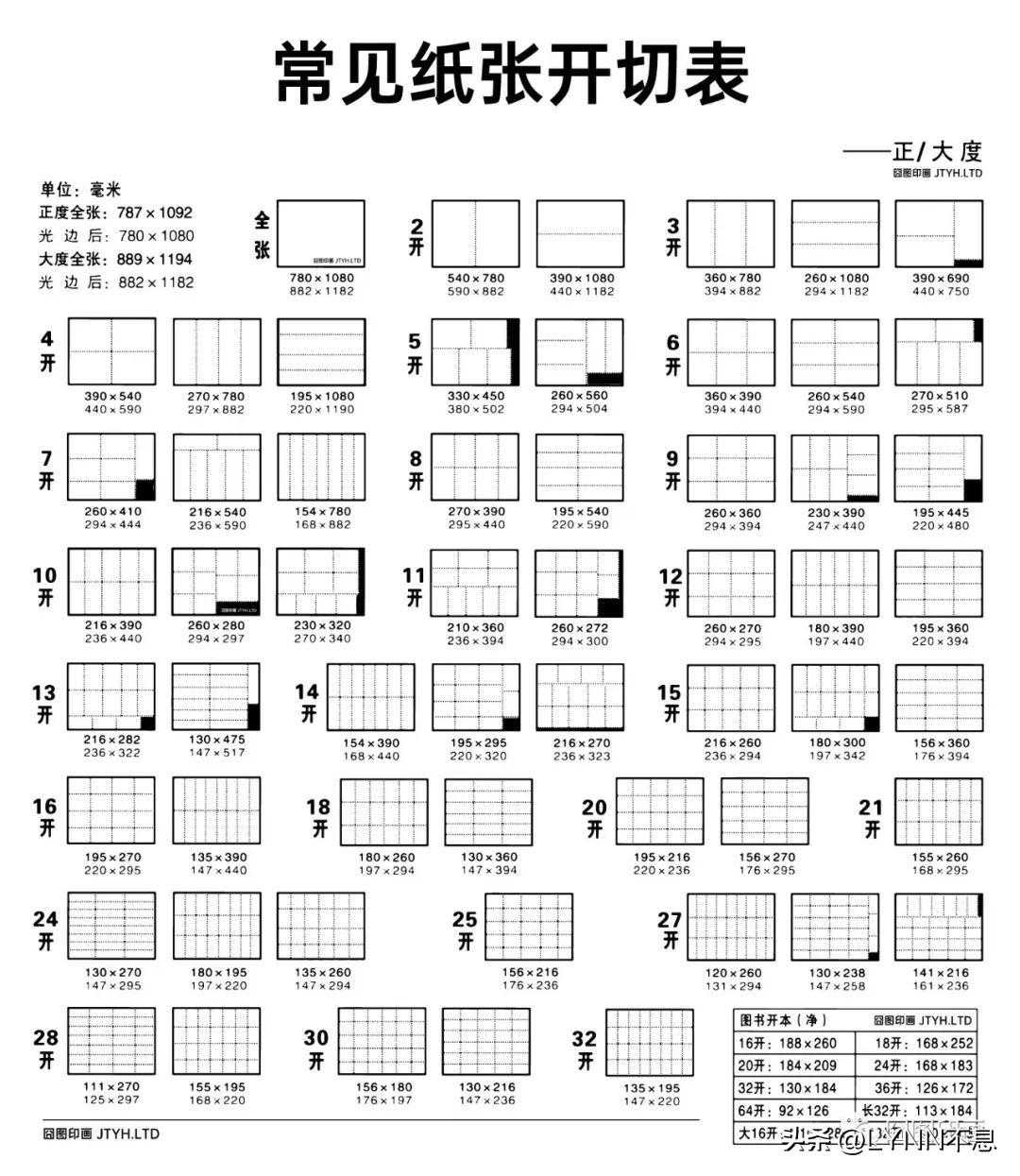 在印刷业,最常用的纸张规格是大度纸和正度纸。印刷品用纸的大小不仅取决于设计要求,而且还取决于印刷机器。下面囧图印画罗列了市场上最常用的开本尺寸。