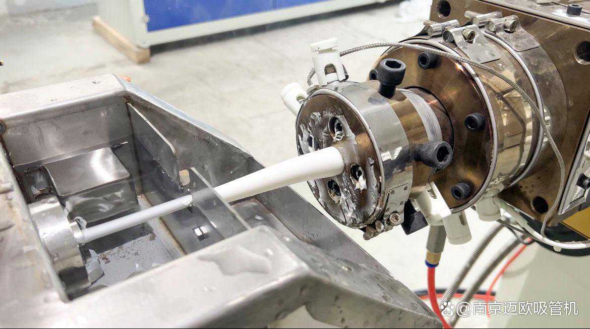 整个生产过程是将吸管料倒入料斗中,进入挤出机螺杆加热区,被加热融化充分均匀的混合搅拌,使其变的可塑,并通过模头挤出成型。