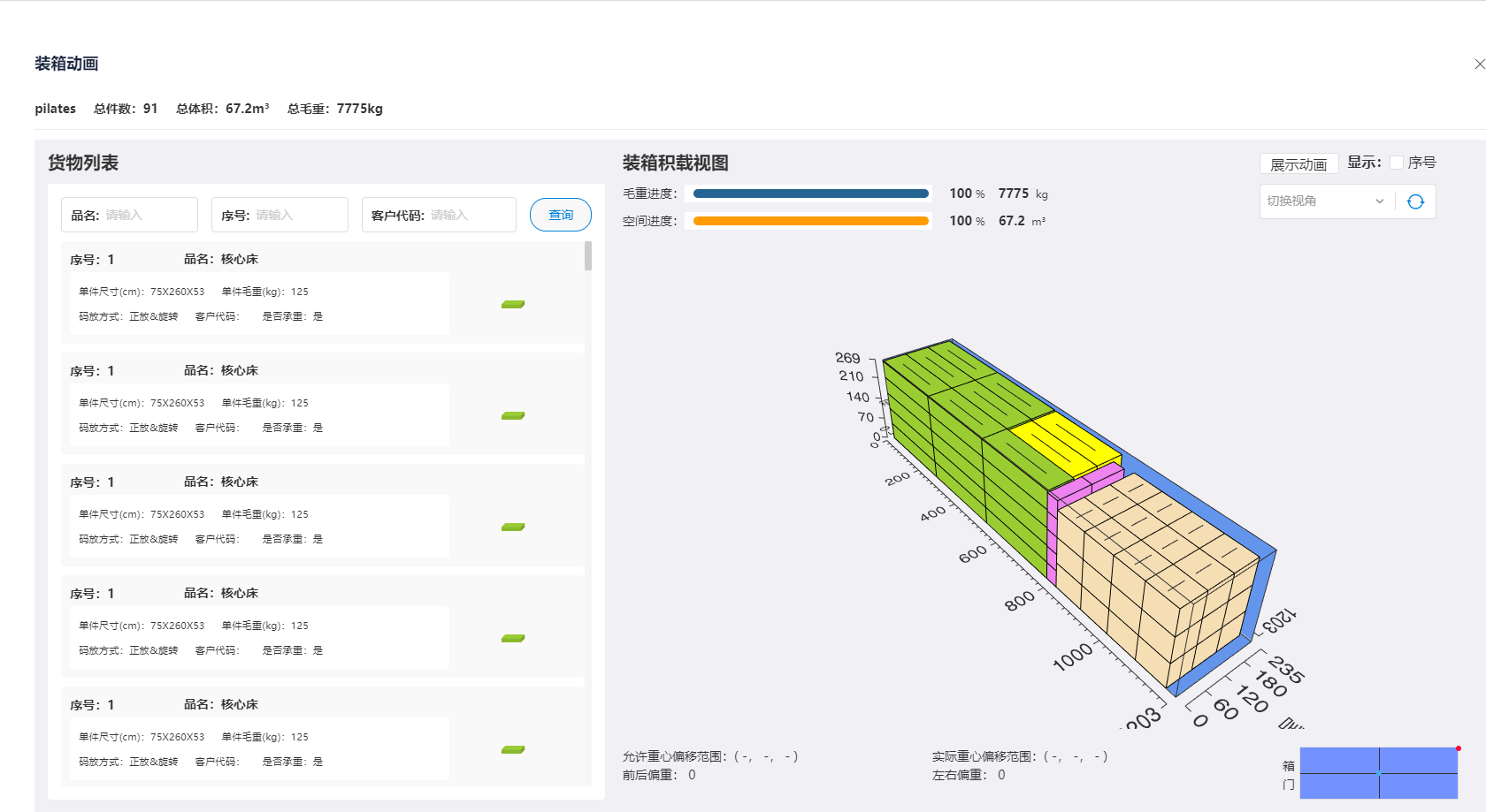 2、优化装箱方案:使用“悠闲装箱”等装箱模拟计算软件,根据不同规格货物的特性和数量,自动生成最佳的装箱方案,提高装箱效率,减少装箱时间和成本,;并可以实时调整优化方案。