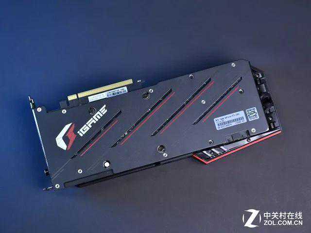 然后是显卡背部,iGameRTX2060UltraOC带有背板设计,金属材质的背板带有四条镂空设计,左上角印有iGame品牌LOGO,同样十分酷炫。