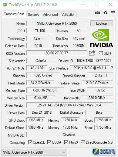 测试前我们先看一看显卡的规格情况。iGameRTX2060UltraOC采用TU106核心,12nm制程工艺,位宽192Bit,拥有1920个流处理器、120个TMU纹理单元、48个ROP光栅单元以及240个Tensor张量核心和30个RT光线追踪核心,显存方面采用了6GBGDDR6,颗粒来自美光。