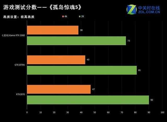 然后是《孤岛惊魂5》,测试画质设置为极高画质,这款游戏并不支持DX12,所以游戏在DX11下运行。在这款游戏中iGameRTX2060UltraOC与GTX1070Ti差距缩小到了10%出头,与RTX2070的差距为19%,和3DMARK基准测试水平相近。