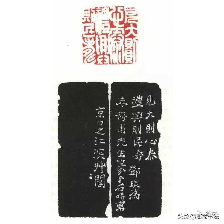 “大”字不似平常作四竖笔的安排,留出了数块红,“心”字也有留红。左边两排虽较密,却也在“礼”字的口部、“寿”字的左右各有小块留红。首排的“则”字为填满空间,取法古文,左侧用两个贝部相叠,与末排“则”字恰成对角而不雷同。