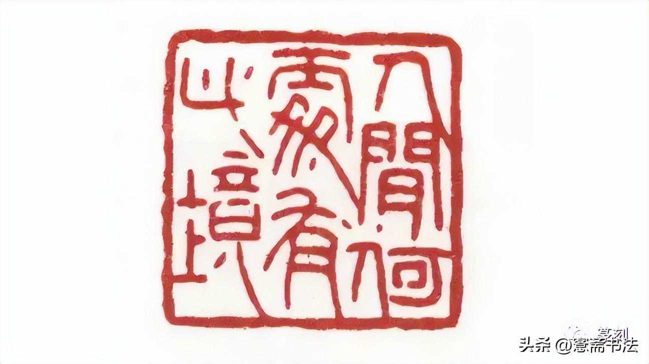 吴咨此印以汉镜铭文字入印,充满隶书意味,穿插了很多斜线。如“人”字斜线伸入“间”的肩部,而且贴到右框;“处”字斜线穿到“间”的左竖;“此”字斜线贴近“境”字右上角;而“境”字末笔原应是竖弯钩,也作斜线与底边相接。