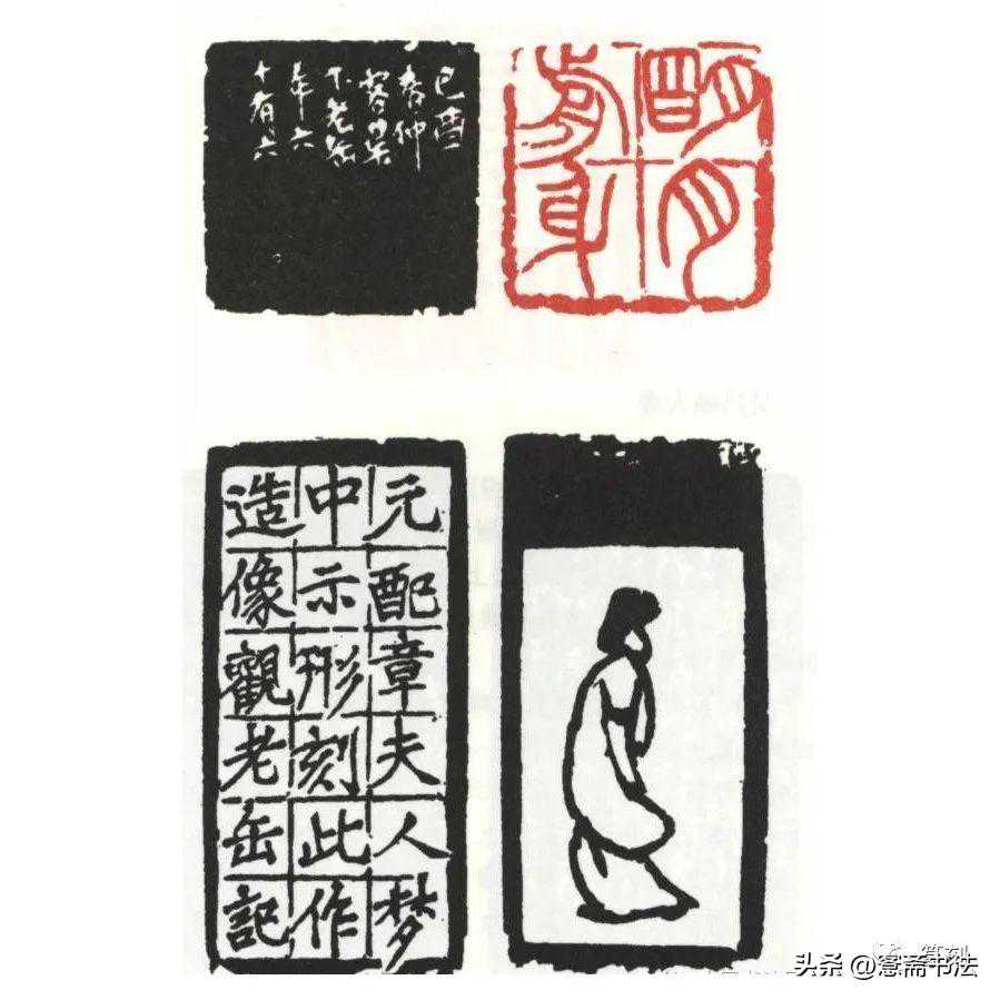 此印刻于己酉(1909年),当时吴昌硕66岁,寓居苏州时忽梦见其原配章夫人,此时距章夫人去世已近半个世纪,吴昌硕感慨万分,刻了“明月前身”这方印,并在印侧刻下章夫人背影,又在另一侧用阳文刻下“元配章夫人梦中示形,刻此作造像观,老缶记”。