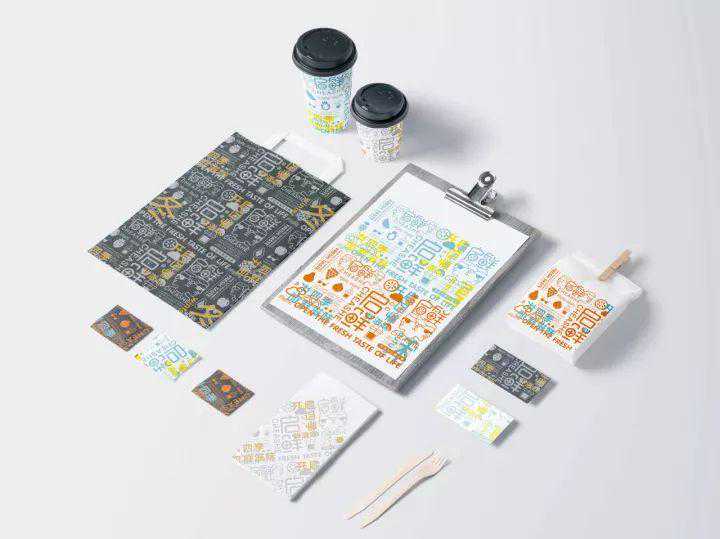饮品杯子设计以文字设计为主不同的文字组合不同的色彩搭配既生动又能突出品牌,其他的VI应用也一直延续文字图形这一主识别形象。这样的设计很新颖很酷,适合主消费人群的视觉诉求。