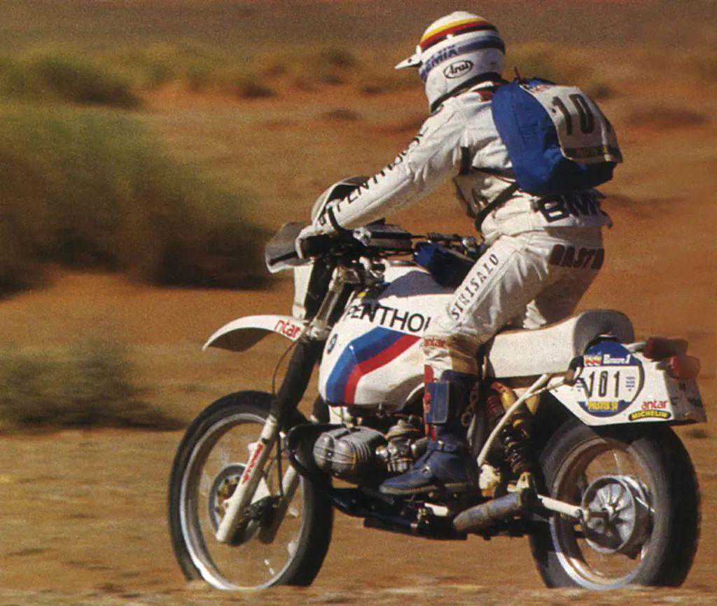 这台大型探险车竞争力很强,甚至能够在凶险的比赛中上过关斩将、摘金夺银。在1981年,哈伯特•奥里奥尔驾驶改装过的宝马R80G/S,勇夺巴黎-达喀尔拉力赛桂冠,由此名声大噪。1983年,哈伯特驾驶宝马探险车,再次登上了达喀尔拉力赛的王者宝座。1984年,冠军头衔换了人选,盖斯顿•拉希尔取代了哈伯特,不变的依然是GS战马。1985年,盖斯顿再次蝉联了达喀尔冠军。为了庆贺显赫的达喀尔战功,宝马特意推出了达喀尔版的R100G/SParis-Dakar,油箱的容量高达35L!