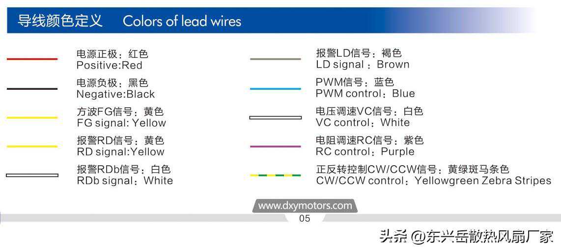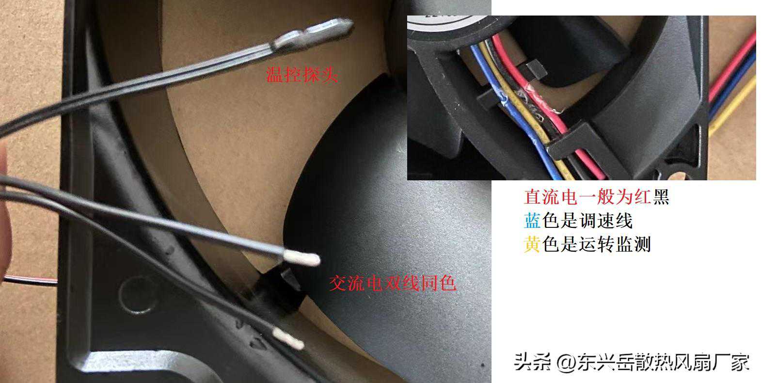 风扇功能支持上,防水的风扇,使用灌胶工艺的话表面是可以观察出来,使用真空镀膜工艺的话比较难甄别,除了防水性能,诸如调速,温控,运行监测等功能从线材上辨别,市面上常规的功能组合有,运转监测加pwm调速风扇,线材就是红黑是正负极,调速是蓝色运转监测是黄色,温控风扇,温控双线较细末端为黑色光滑,温感探头,加红黑正负极,以东兴岳风扇为例,常规线材颜色如下,