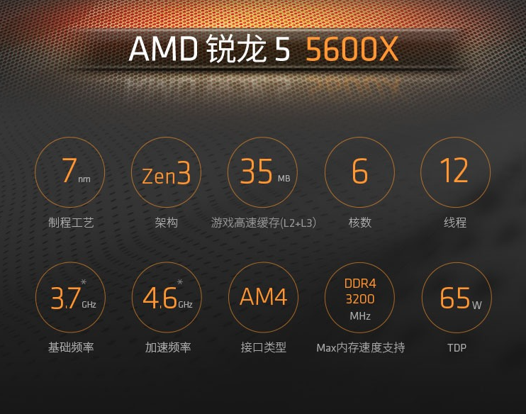 视角拉回到两颗处理器上,AMD锐龙55600X想必大家已经很熟了。台积电7nm制程工艺,“Zen3”核心架构,6核心12线程,35MB容量缓存,3.7GHz基础频率,4.6GHz加速频率,65WTDP功耗设计,即使放到现在,同价位里也依然很有竞争力。