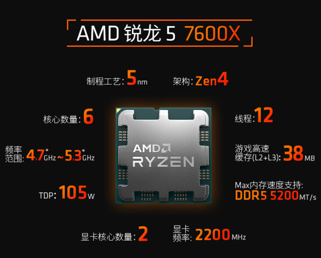 AMD锐龙57600X则在参数指标更强悍了。台积电5nm制程工艺,“Zen4”核心架构和同样的6核心12线程,前面已经说了。L2缓存容量翻倍,总容量达到38MB;基础频率4.7GHz,加速频率达到5.3GHz,在以前是旗舰级的水准;当然,TDP功耗也提升到了105W,但也能接受。