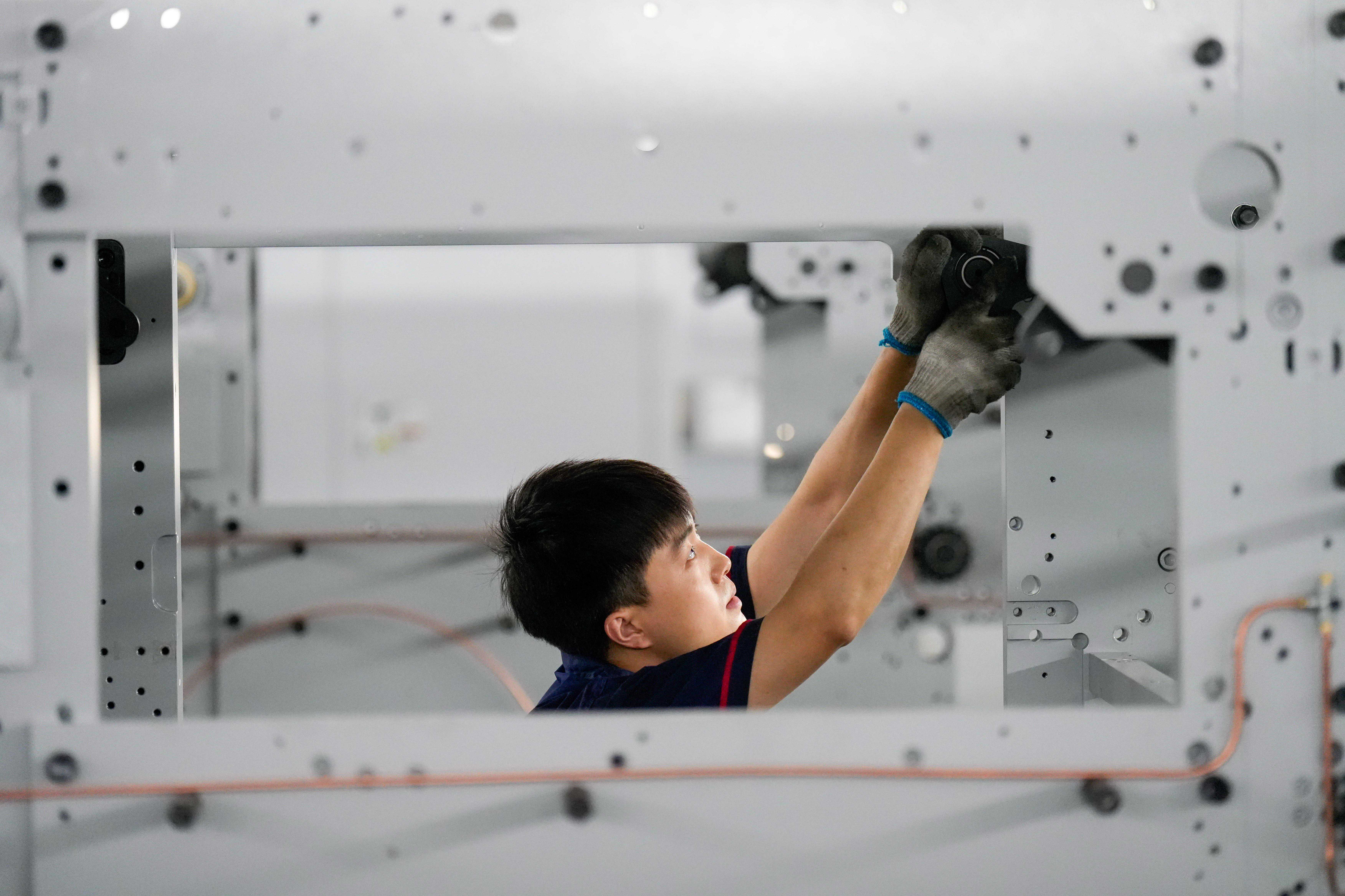 7月13日,河北省玉田县一家印刷包装机械制造企业的工人在安装产品零部件。