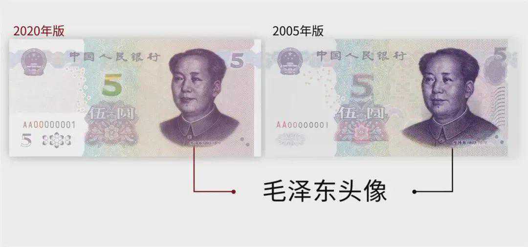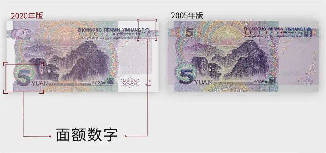 2020年版第五套人民币5元纸币保持2005年版第五套人民币5元纸币规格、主图案、主色调、“中国人民银行”行名、国徽、盲文面额标记、汉语拼音行名、民族文字等要素不变,优化了票面结构层次与效果,提升了整体防伪性能。