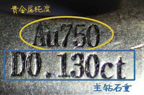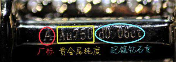 三识克拉重,如果是镶嵌类首饰还会多一步——镶嵌宝石的印记。镶嵌钻石首饰,主钻石重在0.1克拉以上,要刻石重印记。(如图示3,钻戒上“”印记,说明其主钻石重量是0.13克拉,“”说明其配镶钻石总重为0.06克拉)。