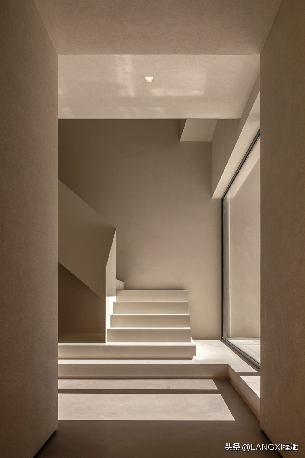 循级而上,空间的路径依次展开,纵横的结构起势,由几何的块状平面切割而成。石材赋予的厚重感被轻盈如羽毛的乳白色调消解,使之构成理想的平衡状态。