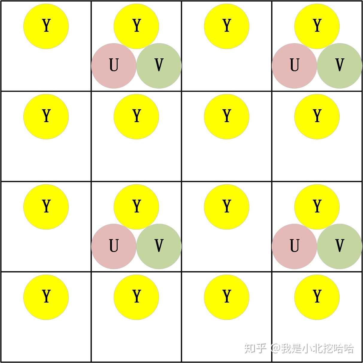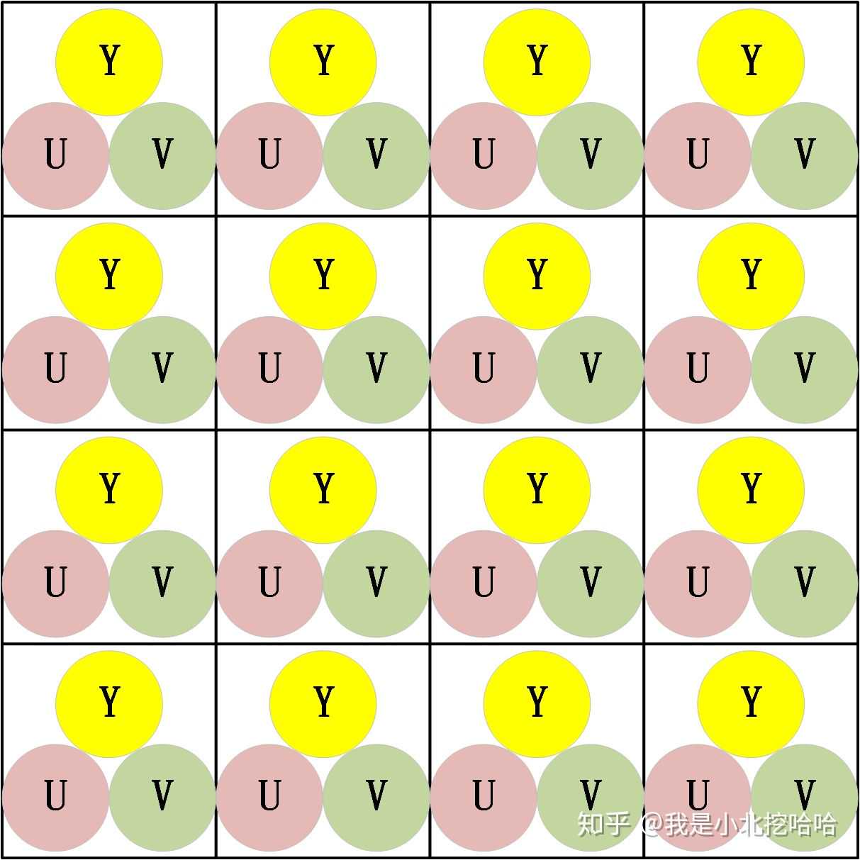 这种设计办法真的很巧妙!前文提到的"人眼对UV的敏感度最低,因此可以极大比例地压缩UV两个通道的数值",且对于图像而言,相邻的区域像素的色彩、饱和度一般非常接近,因此这种以2X2矩阵为基本单位,只保留1组U\V分量合情合理。