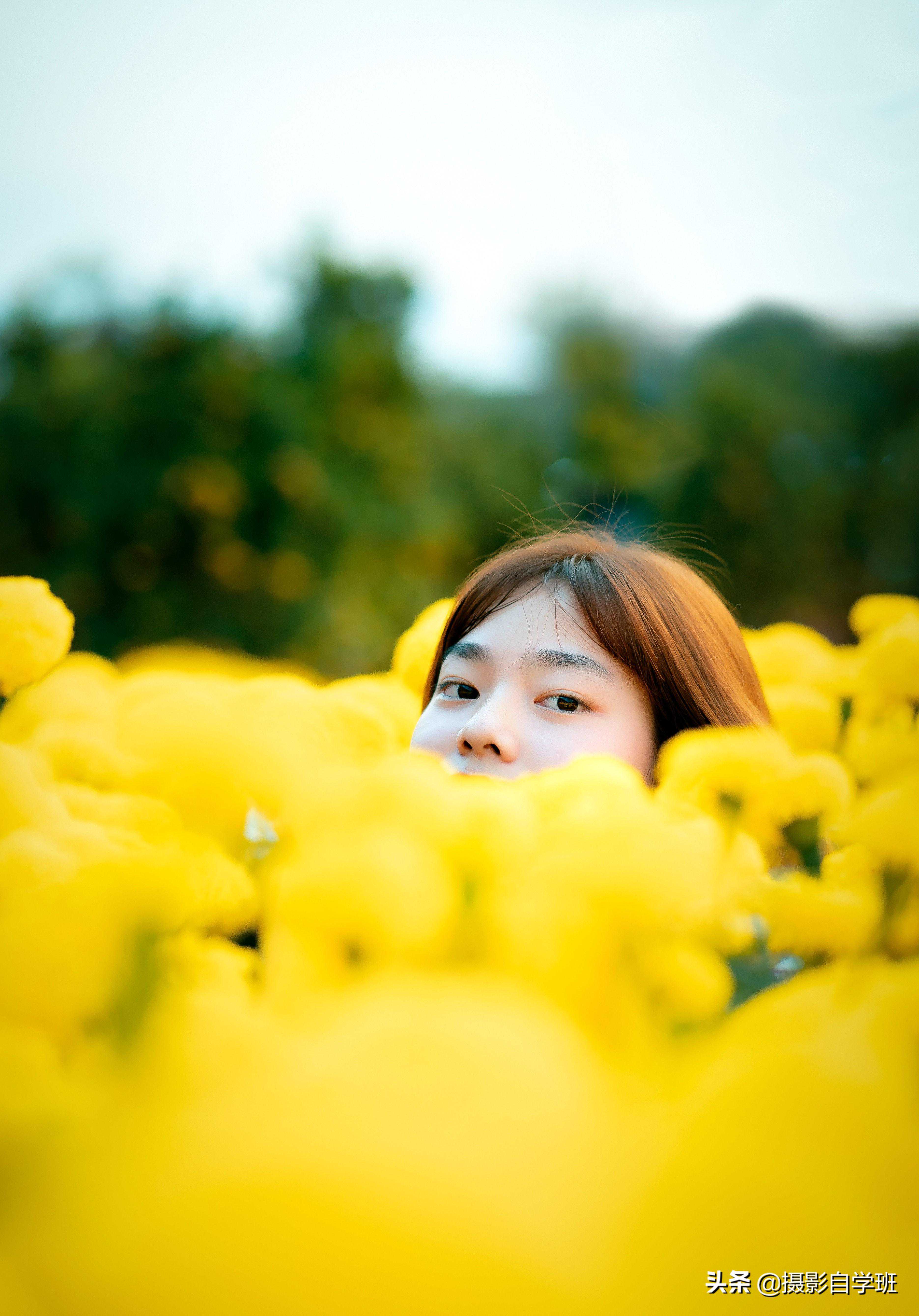 在花丛中拍摄,不要像上图这样,让花海把人的脸,全盖住。而可以像下图这样,双手托腮,自然可爱。