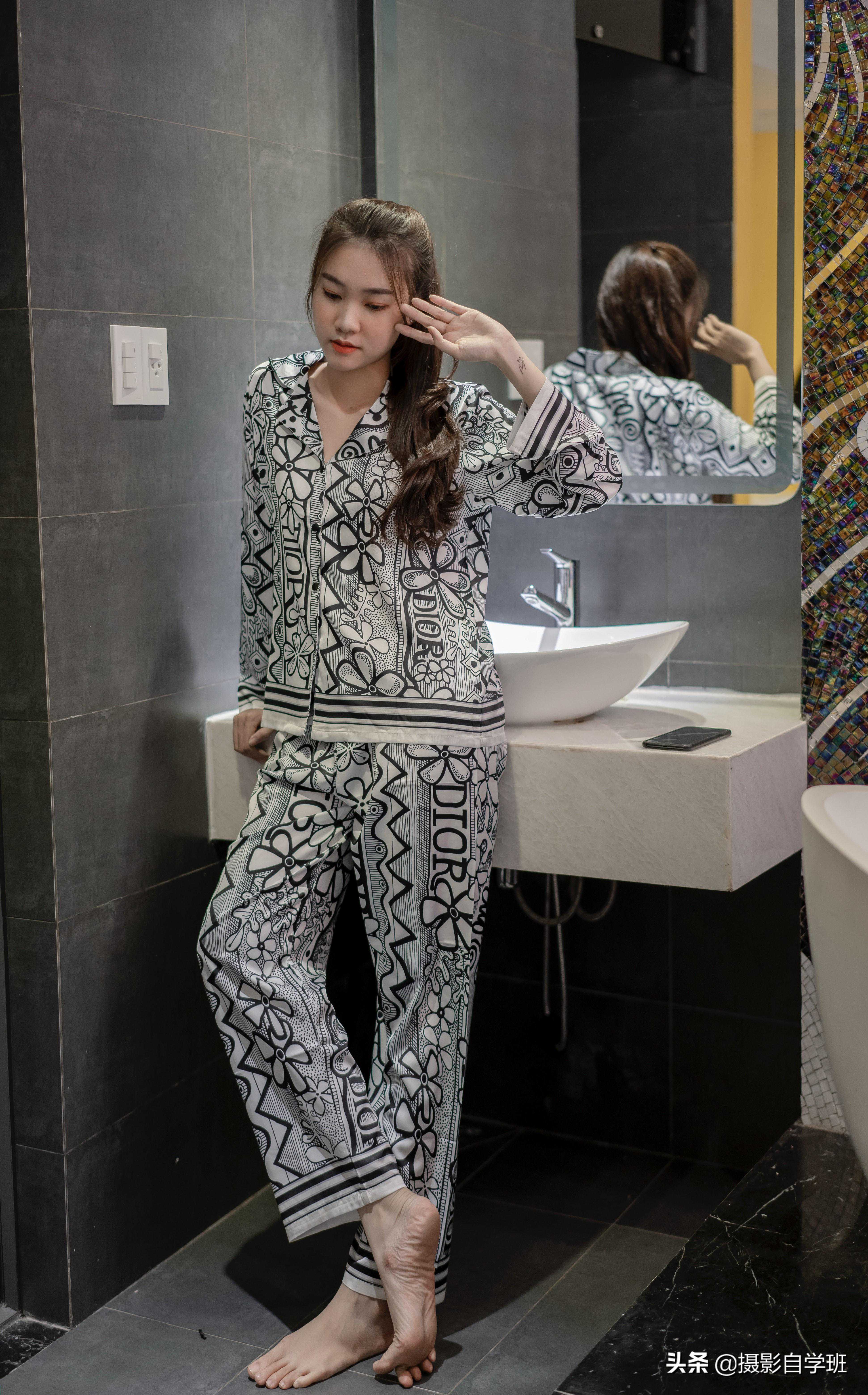 出差、旅游,在酒店里就能拍出好看的照片,手如果没地方放,也不要像上图这样,而完全可以像下图这样,手放到洗手台面,重点是,两脚前后错开,拍摄机位稍微低一点,可以让人显得更高,更瘦。