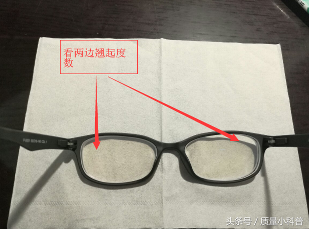 将眼镜拿到光线充足的地方,检查镜片是否平整光滑无开裂痕。然后,将眼镜平方在桌上,看眼镜两边的翘起度数是否相同。