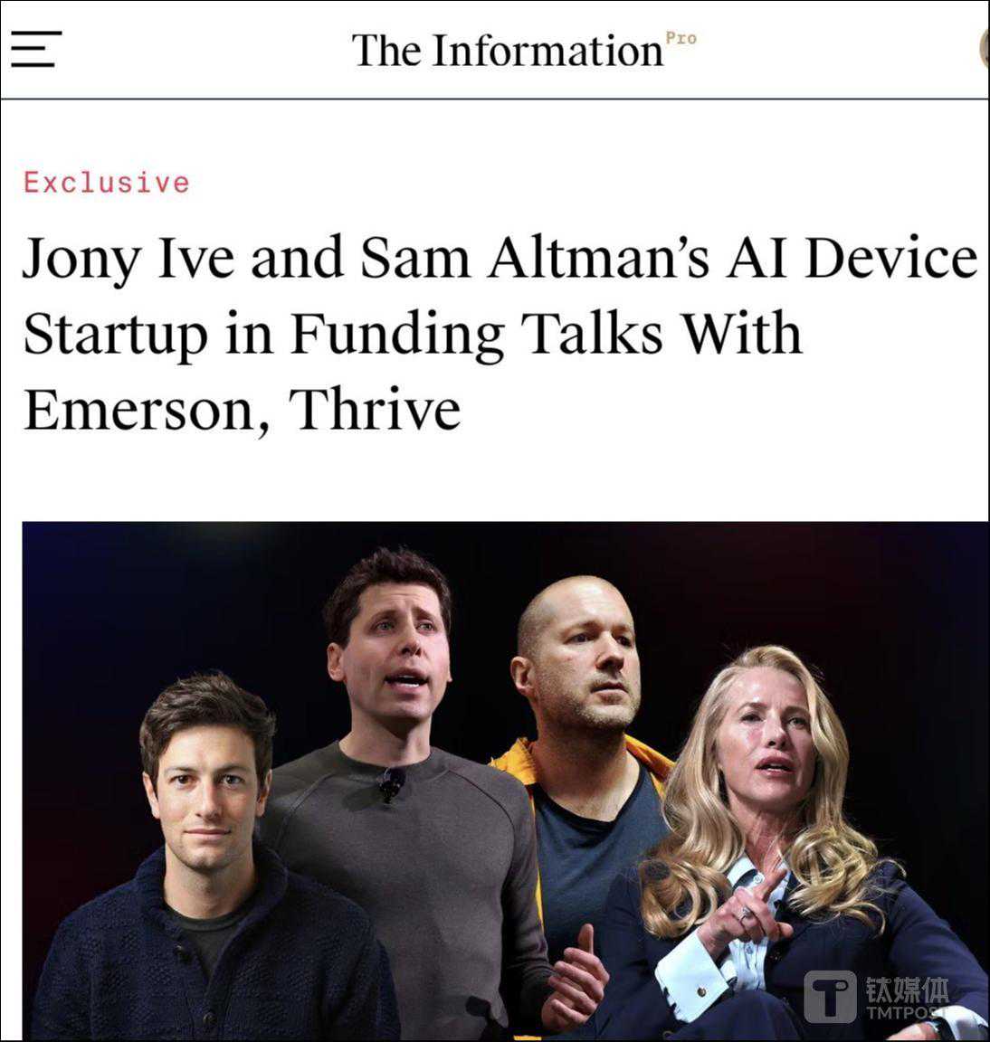 报道称,该公司已与乔布斯遗孀劳伦·乔布斯(LaurenePowellJobs)领导的EmersonCollective、OpenAI重要投资人ThriveCapital进行讨论。此外,两人还在与软银CEO孙正义进行商谈,为他们即将成立的AI设备企业提供资金。