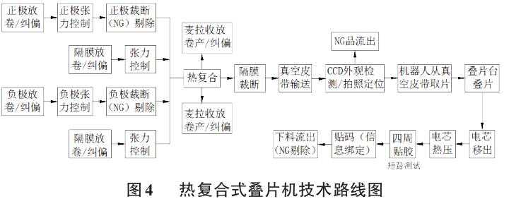 热复合式叠片机主要由制片复合段、堆叠段、叠片热压段、包胶下料段组成,能够实现对极片隔膜自动放卷、自动纠偏、张力控制、极耳抚平和导向、除尘、极片截断和送料、热复合、CCD定位和叠片、包胶、称重贴码等功能。热复合式叠片机的技术路线如图4所示,具体的工艺过程是:正负极卷、隔膜卷由伺服电机自动放卷,经过张力控制和纠偏,通过极片裁切装置将正负极片裁切为定长的单片,再将正、负极单片与双层隔膜送进烘箱内进行预热,在极片和隔膜的传输过程中,使用麦拉膜对极片和隔膜进行保护。完成预热后通过辊压进行单元复合,再通过隔膜切断机构裁切成独立的叠片单元。独立的叠片单元在真空输送带上吸附运送至CCD拍照位置,经过拍照定位后将位置信息传送至搬送机械装置。搬送机械装置通过吸附叠片单元,将其堆叠到叠片台上,堆叠至需要层数后,再将极芯输送至热压平台完成热压。热压后极芯进入包胶工位进行短路测试并完成四周包胶,称重后在表面贴码,实现信息绑定。最终进行NG自动剔除,将合格极芯转至下一道工序。