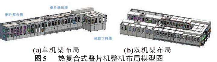 热复合式叠片机可根据电池生产的需要选择相应的布局方式,目前已开发出单机架布局[见图5(a)]和双机架布局[见图5(b)]两种方式。双机架布局方式近似由两组单机架布局对称布置组成,在叠片极芯输出端合拢为一体。双机架布局方式的生产效率为单机架布局方式的生产效率的2倍左右,相比两台单机架布局,双机架布局方式的设备整体空间和占地面积会节省不少。